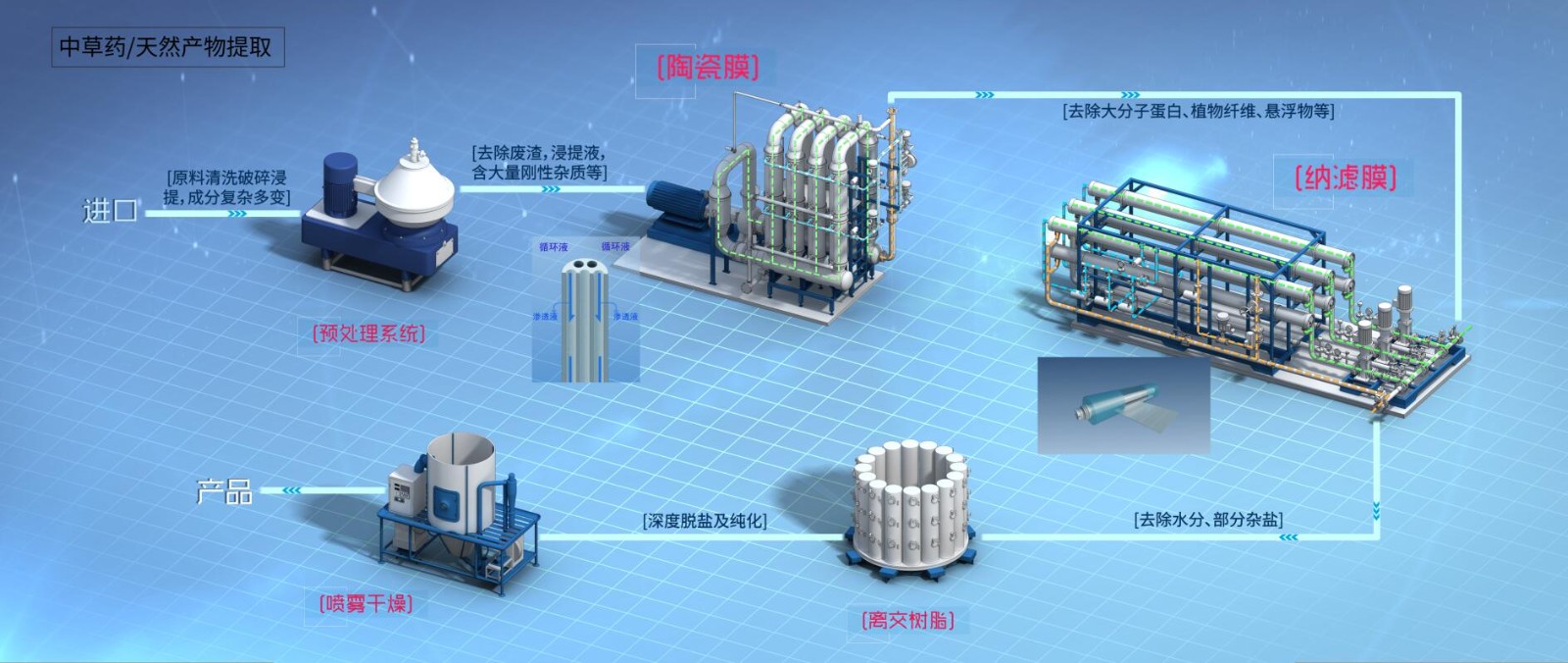 食品与饮料、天然产物的初始料液成分复杂,常含有微生物、纤维、鞣质、油脂、色素、无机盐、酚类、蛋白质、果胶等杂质,传统过滤提纯工艺难以有效去除杂质或纯化产品,膜集成技术整体解决方案能够有效利用膜材料和树脂等与天然产物分子量和电荷等的匹配性,对有效成分进行选择及富集,从而实现产品的过滤、分离与纯化,提高产品质量和收率,降低运营成本并维护人类健康。